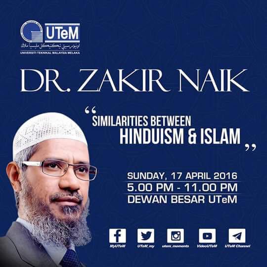 | Telah dibatalkan ( Sumber Berita : Astro Awani) KUALA LUMPUR: Penceramah agama dari India, Dr Zakir Naik, yang dijadualkan menyampaikan ceramah di Universiti Teknikal Malaysia Melaka (UTeM) pada 17 April ini dijangka terpaksa melupakan hasrat itu. Ini berikutan arahan Ketua Polis Negara, Tan Sri Khalid Abu Bakar, yang menyatakan pihak polis merasakan majlis itu tidak boleh diteruskan demi ketenteraman awam dan sensitiviti agama di Malaysia. Artikel Lain : Biodata Dr Zakir Naik Arahan itu turut disampaikan Khalid melalui akaun Twitternya: |